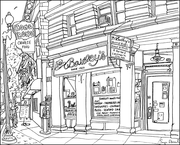 More Harvard Square Illustrations: Street Musician, Winthrop Park | Bartley’s Burgers | Weeks’ Bridge | Pinocchio’s Pizza | The Inn at Harvard | Out of Town News/Taxis | Yenching Restaurant | The Red House | Church Street | Grendel’s Den | Brattle Street